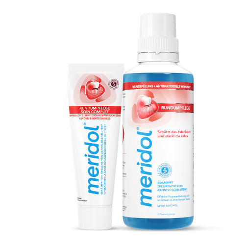 Die meridol® Rundumpflege Zahnpasta und Mundspülung mit ihren dualen Wirkformeln bekämpfen die Ursache von Zahnfleischbluten und Entzündungen*. Sie schützen Ihr Zahnfleisch und stärken Ihre Zähne.